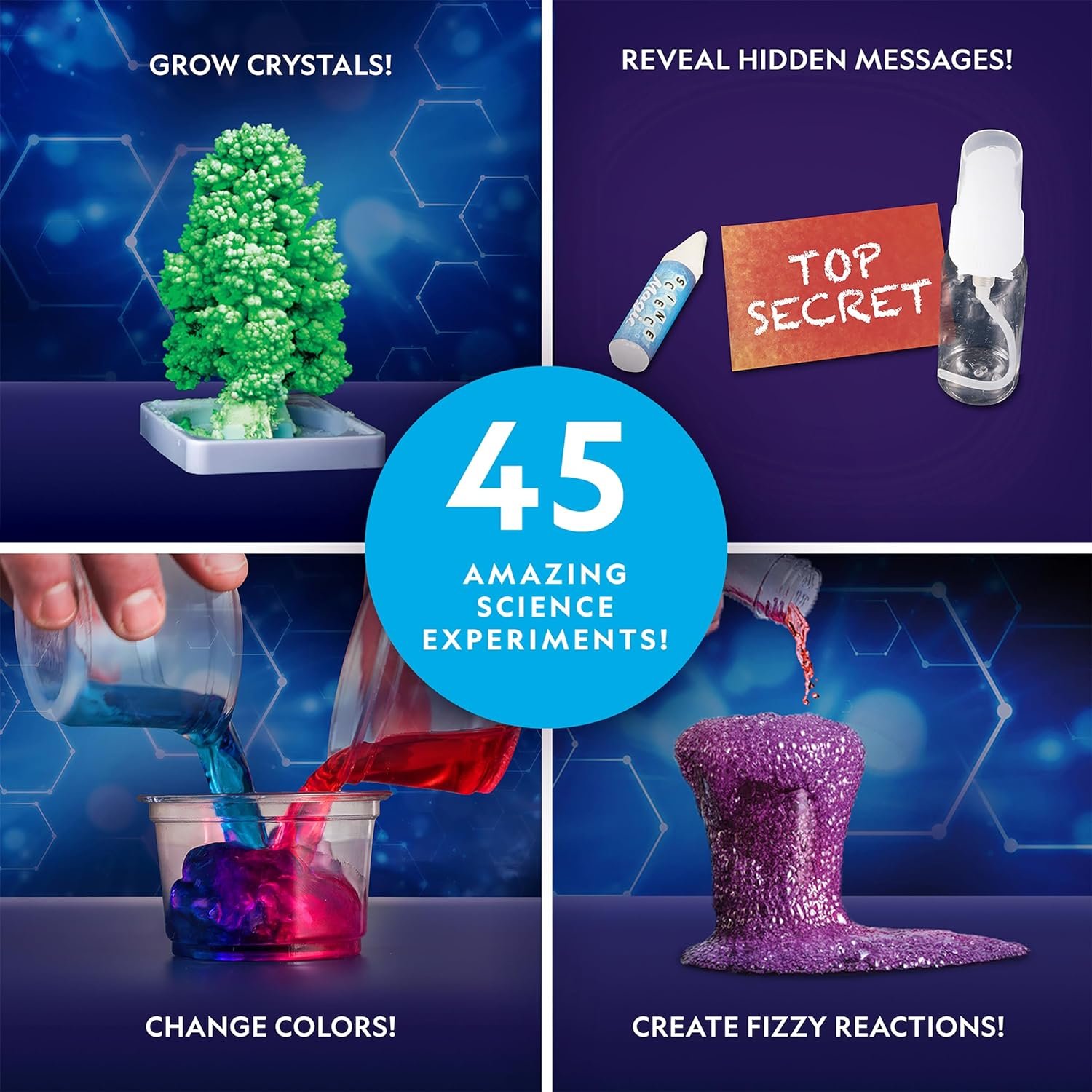 - A TOTAL OF 45 SCIENCE EXPERIMENTS FOR KIDS – The chemistry set itself comes with more than 15 experiments, but there’s also a bonus guide with 30 additional activities using common household items! This science kit for kids is a great STEM resource!